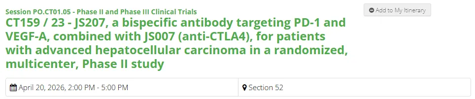 该研究初步结果表明,JS207 联合 JS007 在晚期 HCC 一线治疗中显示出令人鼓舞的抗肿瘤活性与良好的耐受性,为抗 PD-1/VEGF 联合抗