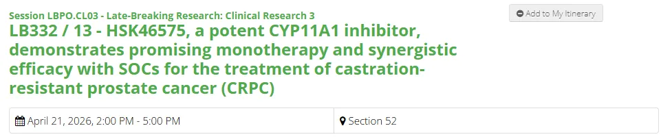 CYP11A1 是类固醇生物合成的关键酶,是治疗去势抵抗前列腺癌(CRPC)耐药性和难治性的理想治疗靶点。HSK46575 作为新一代 CYP11A1