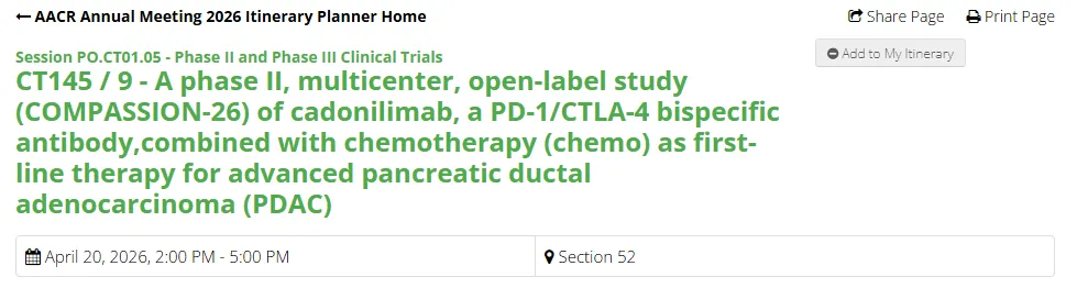 COMPASSION-26 是康方生物启动的一项多中心、开放性、II 期临床研究,旨在评价 PD-1/CTLA-4 双特异性抗体卡度尼利单抗(研发代号:AK104)联合化疗一线治疗不可手术切除的局部晚期或转移性胰腺癌的疗效和安全性。