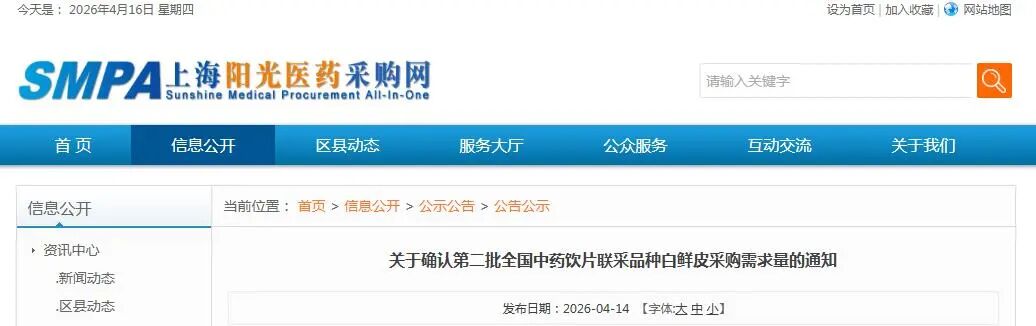 4月14日,全国中药饮片联盟采购办公室发布《关于组织医疗机构确认第二批全国中药饮片联采品种白鲜皮采购需求量的通知》(以下简称通知)。通知对即将开展的第二批饮片联采中白鲜皮的品种等级要求拟作出修改:白鲜皮选货直径等级要求由≥1.2cm调整为≥1.0cm,统货等级直径要求由≥0.8cm调整为≥0.6cm。需要修改采购需求量的机构,可通过系统进行修改,填报时间为2026年4月14日-4月16日。对此,相
