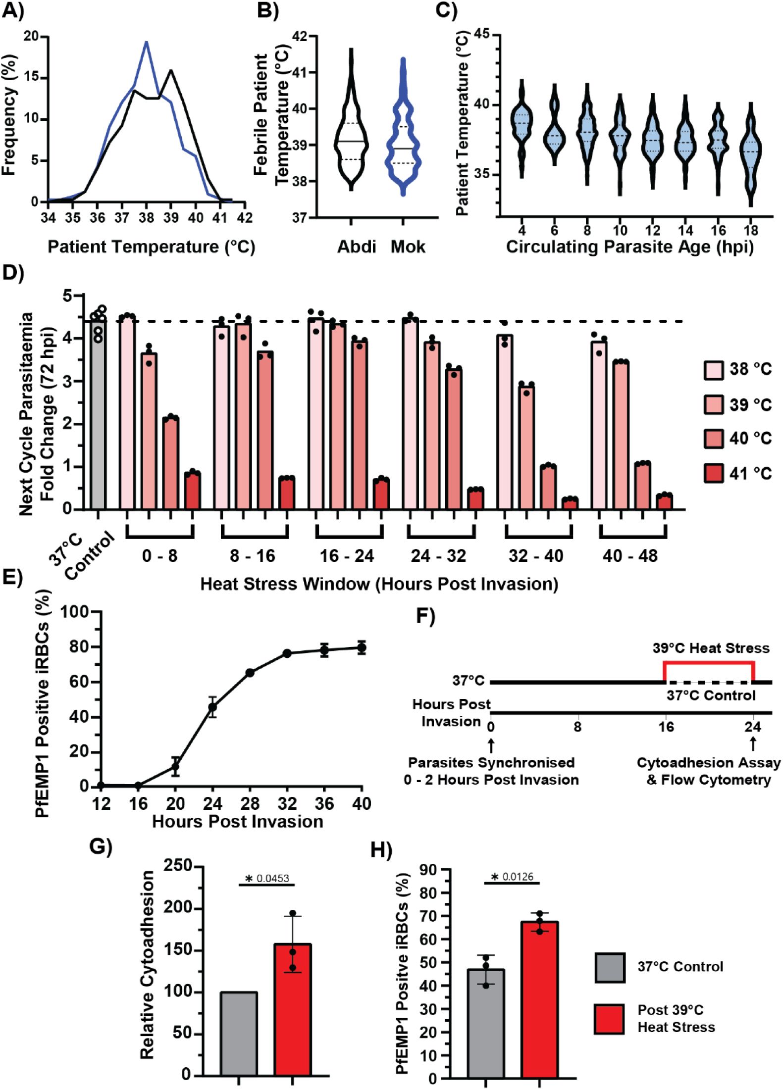 AbstractFever is a hallmark of malaria. Several studies have linked febrile temperatures to reduced parasite viability, but also to increased cytoadhesion, a key driver of pathology. However, differen