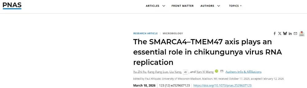 基孔肯雅病毒(CHIKV)对全球公共卫生构成持续威胁。 2026年3月18日,中国科学院武汉病毒研究所王延轶独立通讯在PNAS 在线发表题为The SMARCA4–TMEM47 axis plays an essential role in chikungunya virus RNA replication的研究论文。该研究鉴定出cBAF复合物的核心ATP酶亚基SMARCA4是CHIKV的宿主因子