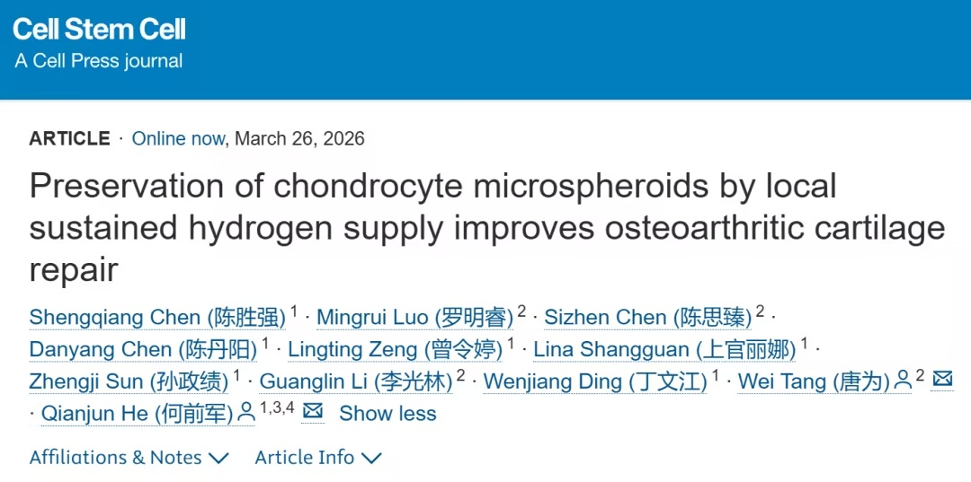 骨关节炎(OA)的炎性病理微环境降解干细胞衍生移植物的细胞状态和功能,并成为开发有效细胞疗法的主要障碍。 2026年3月26日,上海交通大学何前军、中国科学院深圳先进技术研究院唐为共同通讯在Cell Stem Cell(IF=20.4)在线发表题为Preservation of chondrocyte microspheroids by local sustained hydrogen suppl