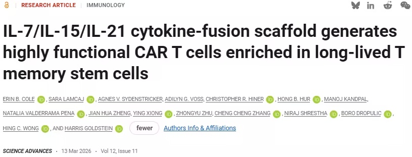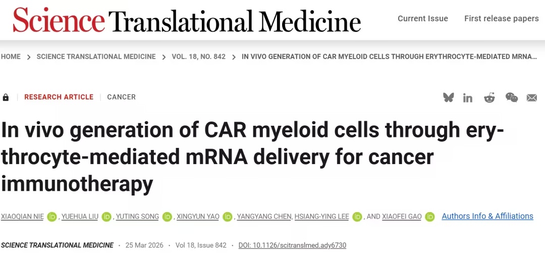 嵌合抗原受体(CAR)修饰的髓系细胞在治疗实体肿瘤方面已成为极具前景的免疫疗法候选药物。 2026年3月25日,西湖大学高晓飞课题组联合北京大学李湘盈课题组(聂小千、刘悦华、姚星云及宋玉婷为本文共同第一作者)在Science Translational Medicine 以封面的形式在线发表题为In vivo generation of CAR myeloid cells through eryt