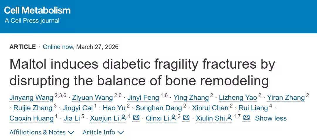 2型糖尿病是脆性骨折的一个主要危险因素,然而骨骼脆性的成因仍不清楚。 2026年3月27日,厦门大学石秀林、李勤喜及李学军共同通讯在Cell Metabolism(IF=20.4)在线发表题为Maltol induces diabetic fragility fractures by disrupting the balance of bone remodeling的研究论文。该研究表明麦芽酚是一