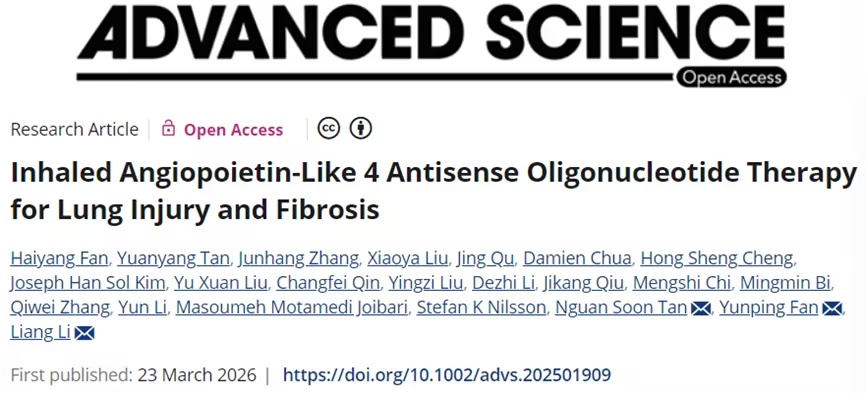 肺部感染与肺纤维化至今仍是难治性疾病,原因在于现有治疗多针对单一通路干预,而非同时调控炎症、屏障完整性与组织重塑这一相互关联的轴系。 2026年3月23日,南方科技大学李亮、中山大学樊韵平、新加坡南洋理工大学Nguan Soon Tan共同通讯在Advanced Science(IF=14.1)在线发表题为Inhaled Angiopoietin-Like 4 Antisense Oligonuc