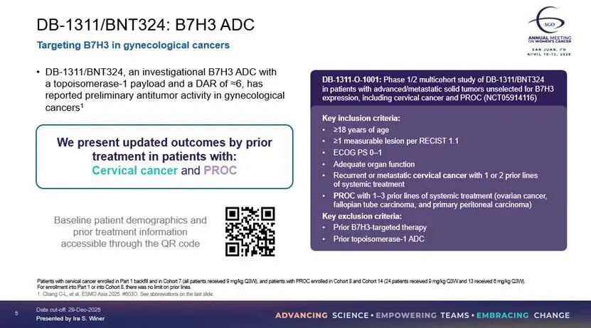 2026 年美国妇科肿瘤学会(SGO)年会上,映恩生物与全球合作伙伴 BioNTech 联合公布了旗下 B7-H3 靶向抗体药物偶联物(ADC)DB-1311/BNT324 的全球多中心 Ⅰ/Ⅱ 期研究最新数据。本次更新不仅完成了样本量的扩容,更首次披露了宫颈癌(CC)与铂耐药复发性卵巢癌(PROC)的详细亚组分析,进一步夯实了这款差异化 ADC 在晚期妇科肿瘤后线治疗中的临床价值。本次公布的数据