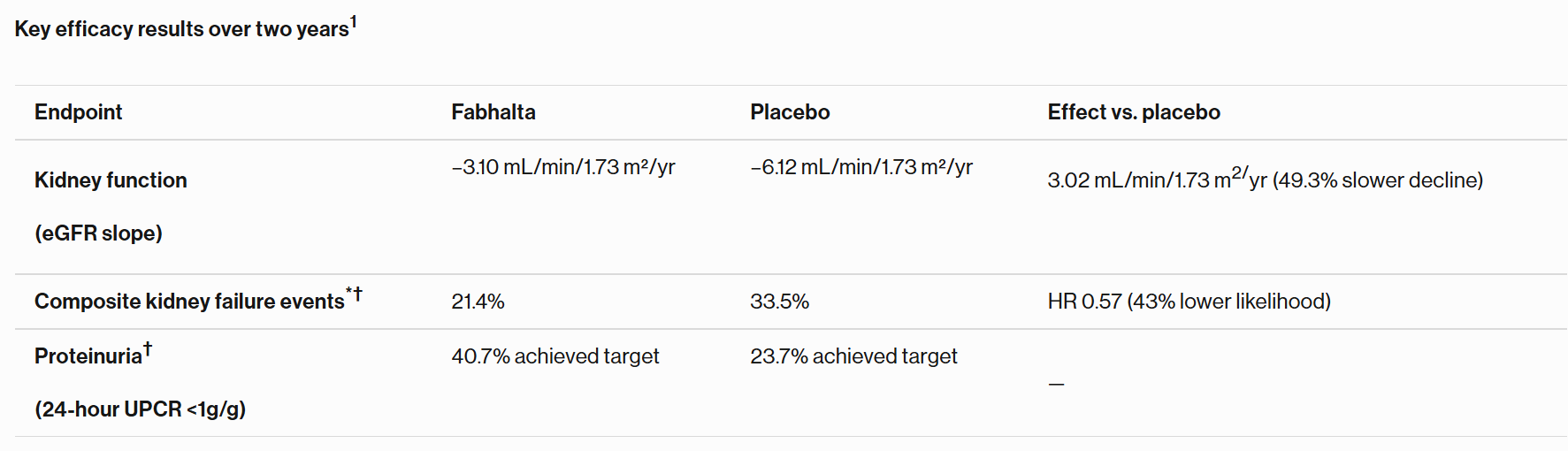 Fabhalta lowered likelihood of progression to kidney failure by 43% in APPLAUSE-IgAN study1 40.7% of patients on Fabhalta demonstrated sustained reduction of protein in urine over two years1 Fabhalta