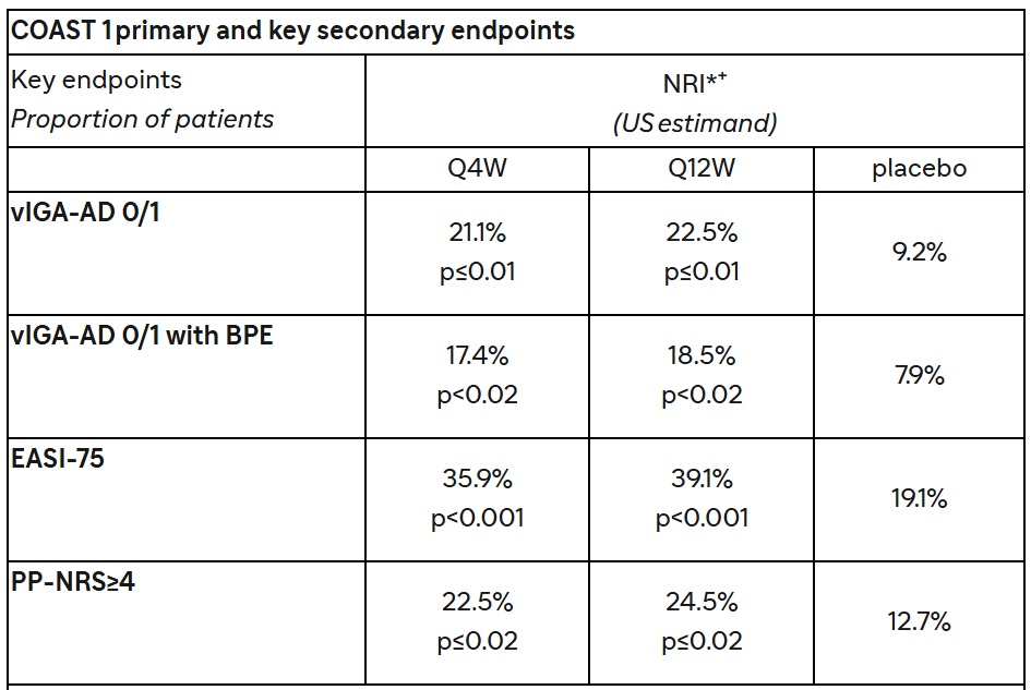 Across the COAST 1, COAST 2, and SHORE phase 3 studies, amlitelimab, dosed either Q4W or Q12W, showed progressively increasing efficacy, with no evidence of plateau at Week 24 across endpoints Data re