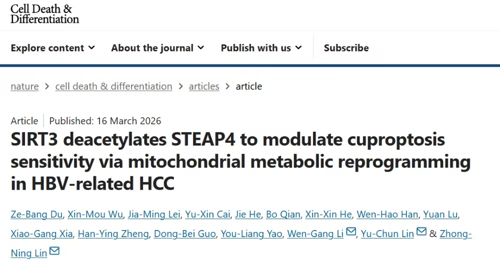 乙型肝炎病毒(HBV)感染仍是肝细胞癌(HCC)的主要病因。铜死亡是一种新近定义的、铜依赖性的调节性细胞死亡形式,可选择性清除线粒体依赖性细胞;HBV是否重塑了这一脆弱性尚不明确。 2026年3月16日,厦门大学林忠宁,林育纯和李文岗共同通讯在Cell Death & Differentiation 在线发表题为SIRT3 deacetylates STEAP4 to modulate cupro