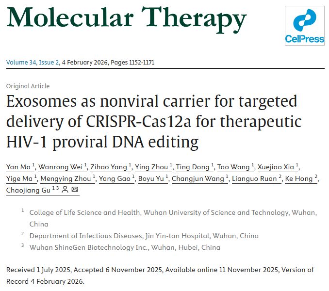 近期,武汉科技大学顾潮江教授团队与潇正生物团队合作,在Cell旗下顶级期刊《Molecular Therapy》上,正式发表了一项颠覆性研究成果,题为“Exosomes as Nonviral Carrier for Targeted Delivery of CRISPR/Cas12a for Therapeutic HIV-1 Proviral DNA Editing”,该成果已于近日入选湖北省