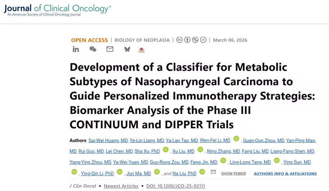 局部晚期鼻咽癌患者急需个性化免疫治疗策略(NPC)。 2026年3月9日,中山大学柳娜团队在Journal of Clinical Oncology(IF=43.4)在线发表题为Development of a Classifier for Metabolic Subtypes of Nasopharyngeal Carcinoma to Guide Personalized Immunother