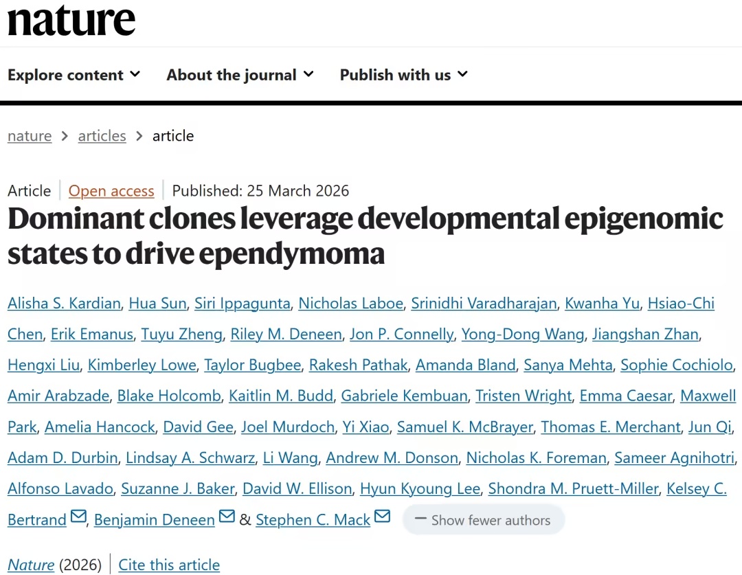 ZFTA–RELA 是儿童额叶室管膜瘤(EPN)中最常见的遗传变异,足以在小鼠体内引发肿瘤。尽管其具有致癌潜力,但 ZFTA–RELA(ZR)几乎仅见于儿童 EPN 中,肿瘤位于中枢神经系统额叶的上部区域。 2026年3月25日,圣犹达儿童研究医院Stephen C. Mack团队在Nature 在线发表题为Dominant clones leverage developmental epigen