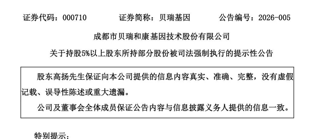 因股票质押回购业务违约,成都市贝瑞和康基因技术股份有限公司(以下简称“贝瑞基因”,证券代码:000710)持股5%以上股东高扬所持部分股份将被司法强制执行。公告显示,股东高扬持有公司股份21,383,084股,占公司总股本的6.05%,为公司控股股东。由于其在国信证券股份有限公司开展的股票质押回购业务发生违约,成渝金融法院裁定强制变现其持有的3,535,214股“贝瑞基因”股票,占公司总股本的0.