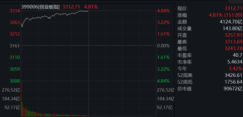 2026.04.08本文字数:1048,阅读时长大约2分钟作者 | 一财阿驴11:31 A股午盘丨创业板指半日涨4.81%截至午间收盘,沪指涨1.92%,深成指涨3.87%,创业板指涨4.81%,科创综指涨4.53%。盘面上,算力硬件、AI应用、半导体、人工智能、黄金、金融科技、消费电子、工业金属、商业航天、人形机器人概念股全线走强;油气、煤炭板块调整。沪深两市半日成交额1.54万亿,较上个交易日