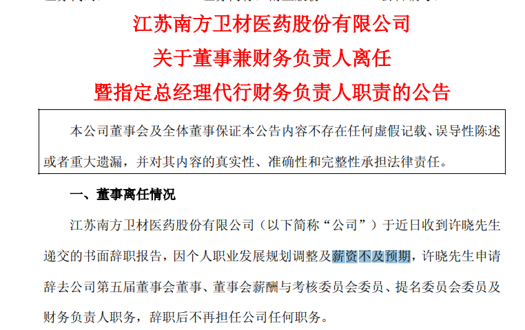 南卫股份,这家做创可贴和医用胶带起家的常州上市公司,最近贡献了A股2026年开年最奇葩的一条高管辞职理由——公司董事兼财务负责人(CFO)许晓先生,因“个人职业发展规划调整及薪资不及预期”,申请辞去一切职务,不再担任公司任何职务。“薪资不及预期”——敢在A股公告里把“嫌工资低”写得这么直白,许晓算是医药财经遇见的头一个。这背后,到底藏着什么?29万的前任,她给南卫埋了多少雷?先看看许晓接盘前,南卫