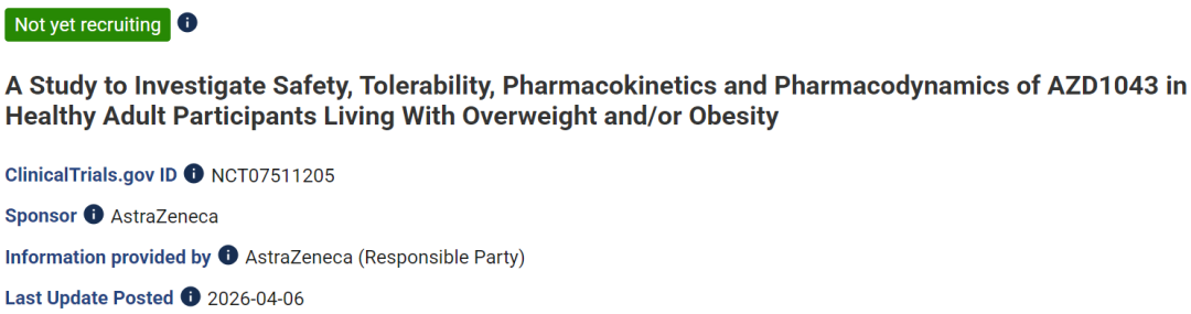 ▎Armstrong2026年4月6日,阿斯利康在Clinicaltrials.gov网站上注册了AZD1043用于减重的一期临床试验。该一期临床计划入组112例受试者,包含中国、日本患者队列,预计2027年3月初步完成。阿斯利康围绕减重药进行了广泛布局,多款产品进入临床阶段,包括小分子GLP-1(诚益生物引进)、长效Amylin类似物、GLP-1/GCG双靶点激动剂等。2026年1月,阿斯利康以