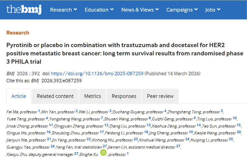 2026年3月16日,由中国医学科学院肿瘤医院徐兵河院士牵头的恒瑞医药创新药吡咯替尼Ⅲ期PHILA研究的最新长期随访数据重磅发表于全球顶级医学期刊《英国医学杂志》(The BMJ)[1]。2023年,PHILA研究首次发表于《英国医学杂志》,以中位15.5个月的随访数据证实吡咯替尼联合曲妥珠单抗和多西他赛(PyroHT)方案一线治疗HER2阳性晚期乳腺癌患者具有显著的PFS获益和可控的安全性[2]