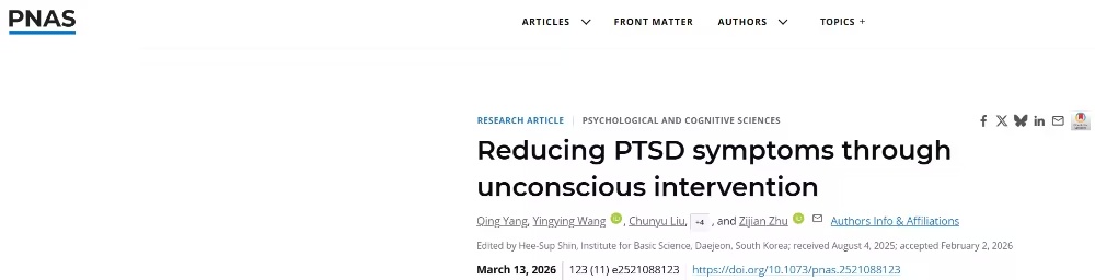 创伤性记忆闯入是创伤后应激障碍(PTSD)的核心症状。常规疗法通常要求患者明确且痛苦地再次暴露于创伤线索,这常导致病情严重患者的高脱落率。 2026年3月13日,陕西师范大学朱子建独立通讯在PNAS 在线发表题为Reducing PTSD symptoms through unconscious intervention的研究论文。该研究探讨了是否可以通过无意识干预有效减少创伤记忆闯入,其方法是在