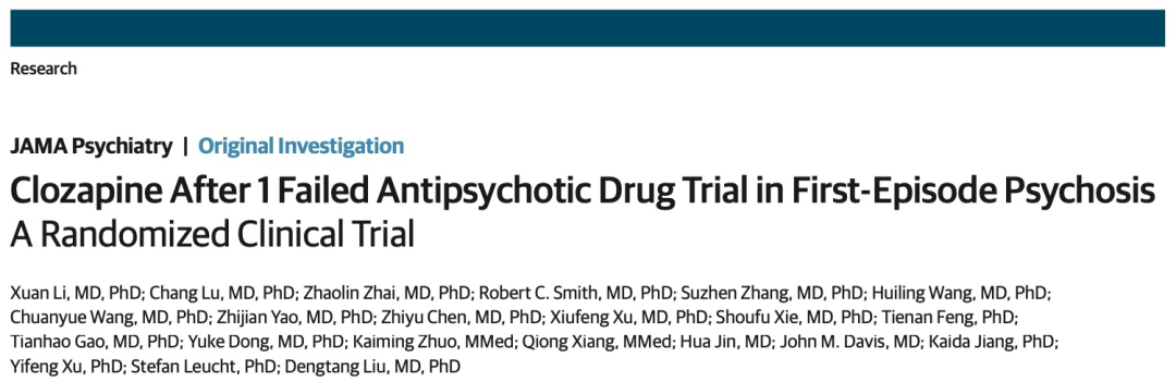 尽管超过50%首发精神病患者对初始抗精神病药物治疗有效,但首次治疗失败患者换用第二种药物时有效率显著下降至34%,最终约20-30%患者发展为难治性精神分裂症。目前国内外指南均认为氯氮平是难治性精神分裂症的“金标准”治疗,但难治性患者使用氯氮平治疗时机往往过分延迟、某些国家或地区甚至较少使用氯氮平。几年前,欧洲研究曾建议早期(如3个月以内/首次治疗失败患者)使用氯氮平有利于提高患者的治疗效果,但目