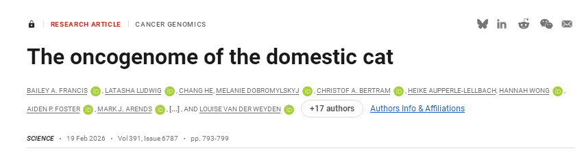 “通过比较不同物种的癌症基因组,我们对癌症的成因有了更深入的了解。我们的主要发现之一是,猫癌症的基因变化与人类和狗的一些基因变化相似。这可以帮助兽医领域的专家以及研究人类癌症的专家,表明当知识和数据在不同学科之间流动时,我们都可以受益。”科学家首次大规模绘制了猫的癌症遗传图谱,揭示了与人类癌症的主要重叠。关键的突变,比如与乳腺癌相关的突变,在这两个物种中都存在,而且一些人类抗癌药物可能对猫也有效。