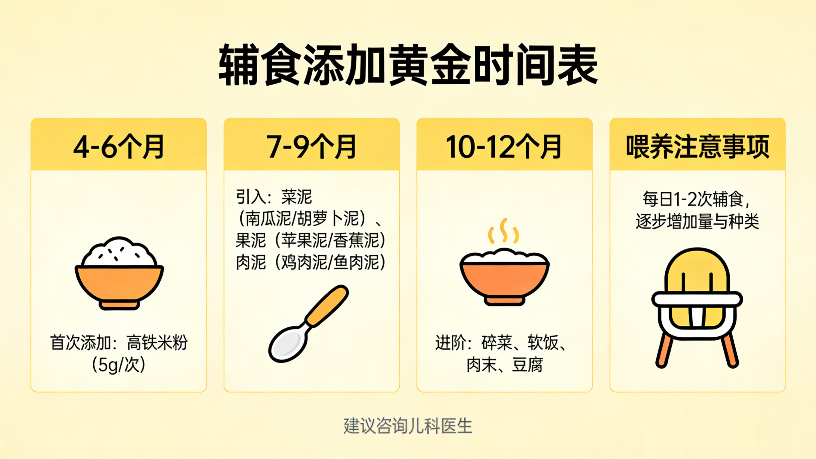 辅食添加并非简单的“到年龄就加”,而是需要结合宝宝的生理发育信号、营养需求,遵循“由稀到稠、由少到多、由单一到多样”的原则,循序渐进推进。世界卫生组织(WHO)明确建议,宝宝辅食添加的最佳时间为6月龄左右,最晚不超过8月龄,过早或过晚添加都会影响宝宝的生长发育。本文结合宝宝不同月龄的发育特点,制定详细的辅食添加黄金时间表,明确各阶段的核心任务与注意事项,帮助家长科学、规范地完成辅食添加。一、辅食添