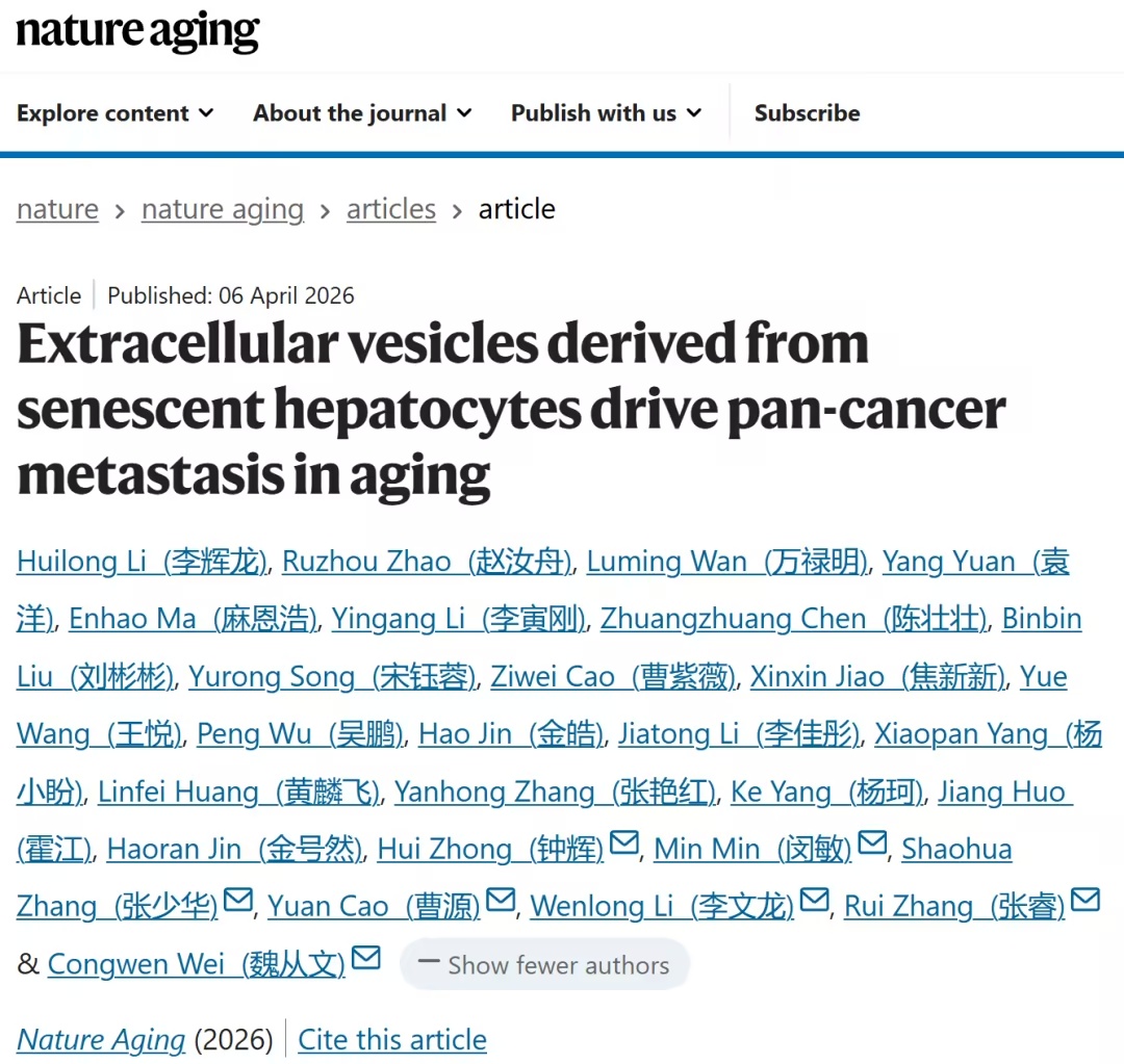 恶性肿瘤是65岁以上老年人死亡的主要原因,转移是主要驱动因素。新的证据表明,年龄相关的代谢变化和分泌因子增加了转移的风险,但其潜在的机制仍不清楚。 2026年4月3日,军事医学研究院魏从文、大连理工大学张睿、北京协和医学院李文龙、中国人民解放军联勤保障部队第九六〇医院曹源、中国人民解放军总医院张少华、闵敏、Beijing Youngen Technology钟辉共同通讯在Nature Aging(