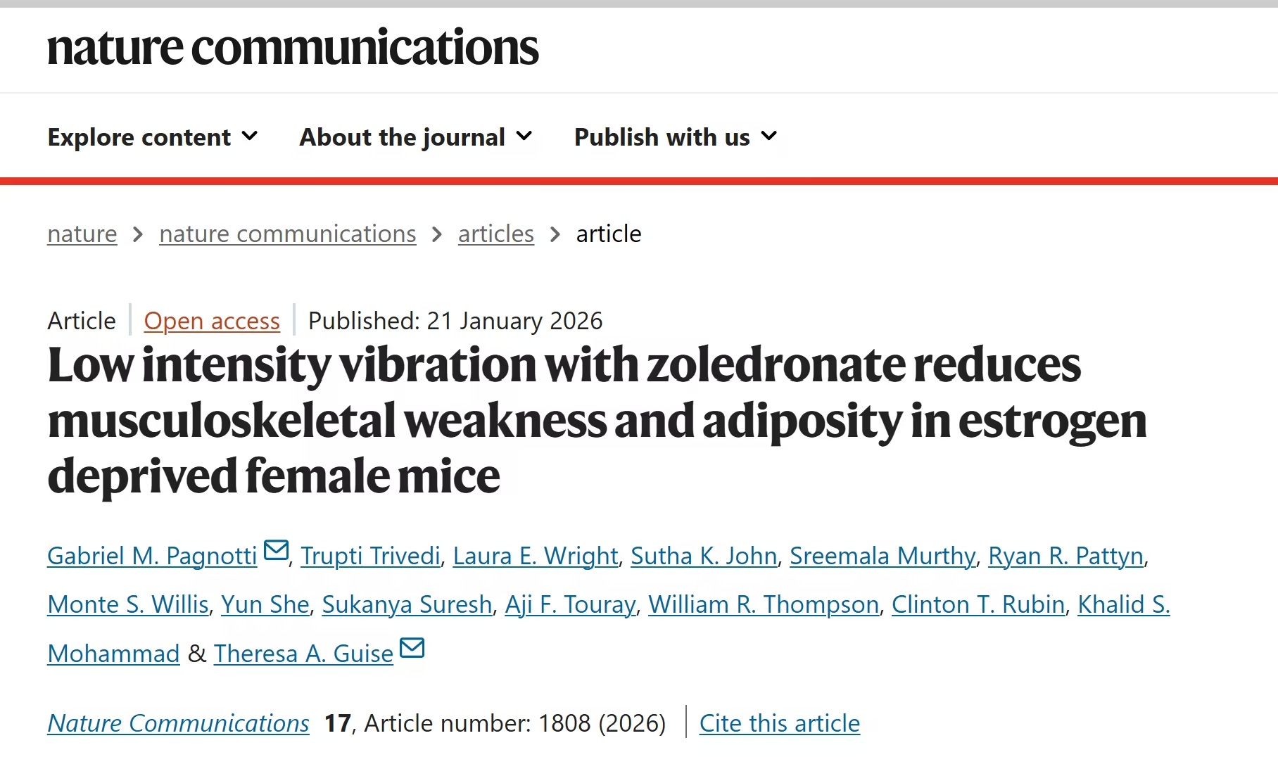 对于激素受体阳性的乳腺癌患者来说,芳香化酶抑制剂是控制肿瘤的重要武器。它通过抑制雌激素生成来阻断肿瘤生长信号,但雌激素的缺失也让骨骼和肌肉付出代价:骨量流失加速、肌肉无力、脂肪堆积。这些问题不仅影响生活质量,还可能导致患者中断治疗,反而影响预后。有没有一种既能保护骨骼肌肉、又不增加身体负担的方法? 近日,Nat Commun上发表的研究给出了新思路。他们发现,一种名为低强度振动的物理干预,每天仅需