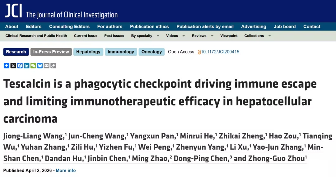 免疫疗法在几种癌症中取得了持久的疗效,但在难治性肝细胞癌(HCC)中疗效有限。肝癌细胞逃避免疫识别和限制免疫检查点阻断(ICB)功效的机制尚未完全确定。 2026年4月2日,中山大学周仲国、陈东萍、赵明共同通讯在Journal of Clinical investigation(IF=13.6)在线发表题为Tescalcin is a phagocytic checkpoint driving i