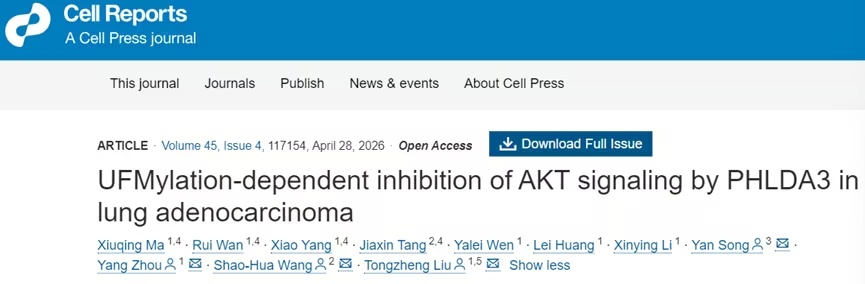 UFMylation 是近年发现的一种类泛素化修饰,由 E3 连接酶UFL1介导,在肿瘤中发挥环境依赖性作用,但其在肺腺癌(LUAD)中的底物与功能尚不明确。 2026年3月25日,暨南大学刘同征、王少华、周洋、Song Yang共同通讯在Cell Reports 在线发表题为UFMylation-dependent inhibition of AKT signaling by PHLDA3 in