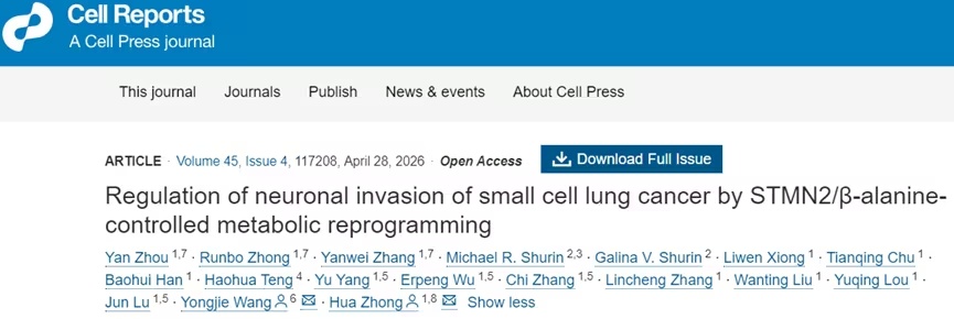 小细胞肺癌(SCLC)神经周围浸润(PNI)发生率高,这一临床特征与不良预后密切相关。 2026年3月28日,上海交通大学钟华、杭州师范大学王永杰共同通讯在Cell Reports 在线发表题为Regulation of neuronal invasion of small cell lung cancer by STMN2/β-alanine-controlled metabolic repro