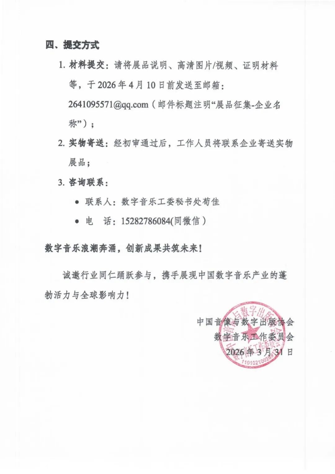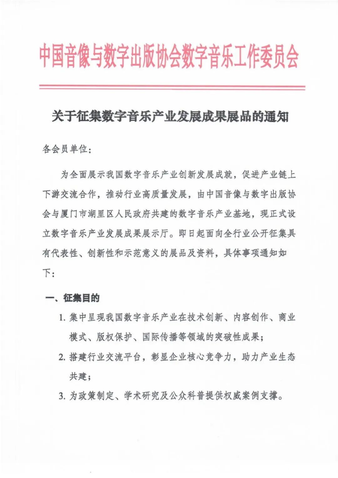 为全面展示我国数字音乐产业创新发展成就,促进产业链上下游交流合作,推动行业高质量发展,由中国音像与数字出版协会与厦门市湖里区人民政府共建的数字音乐产业基地,现正式设立数字音乐产业发展成果展示厅。即日起面向全行业公开征集具有代表性、创新性和示范意义的展品及资料,具体事项通知如下: