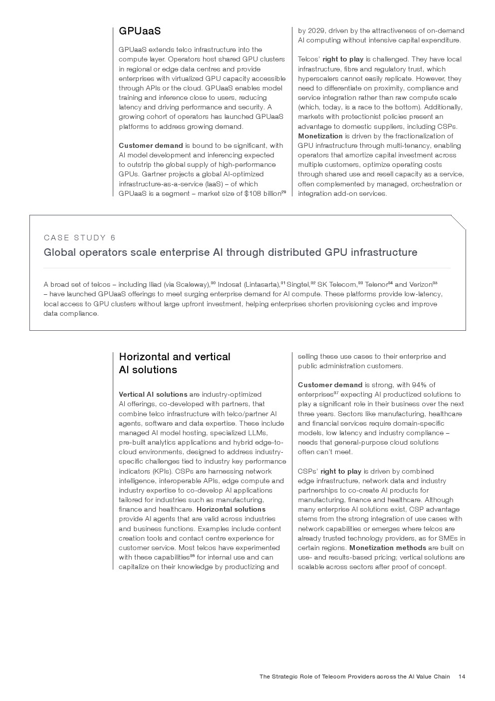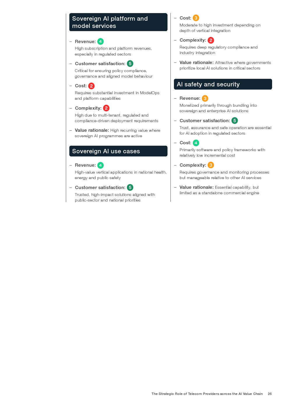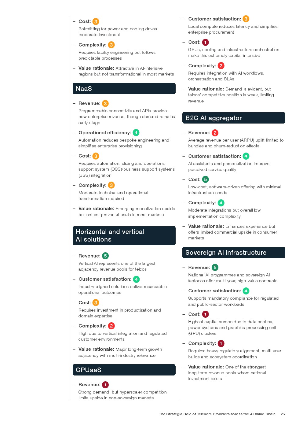 在此背景下,运营商的增长路径被重构为三类。第一类是“现代电信”,核心在于通过AI优化网络效率与体验,实现连接能力的差异化变现。例如AI交互流量预计至2030年以120%年复合增长扩张,推动网络性能定价成为新收入来源 。第二类是“AI技术服务商”,通过NaaS、GPU即服务等模式切入算力与平台层,Analysys Mason预计NaaS收入至2029年达147亿美元,年复合增长42%。第三类是“国家主权型运营商”,参与国家级AI基础设施建设,全球主权AI投资预计2028年达1.5万亿美元,形成长期资本密集型回报池 。
