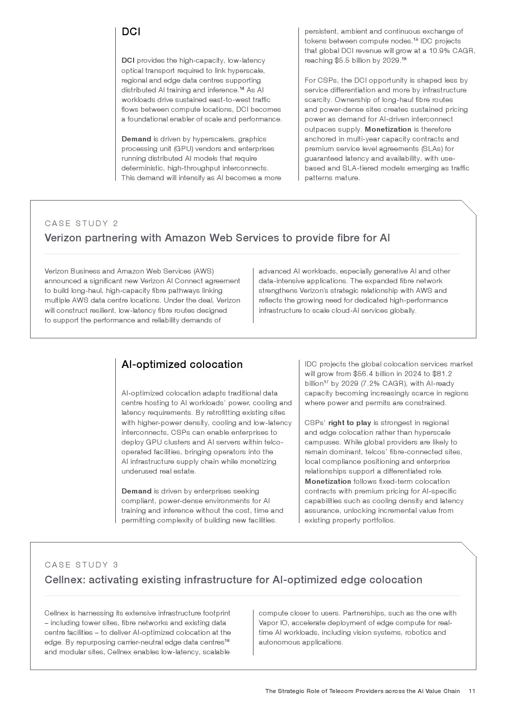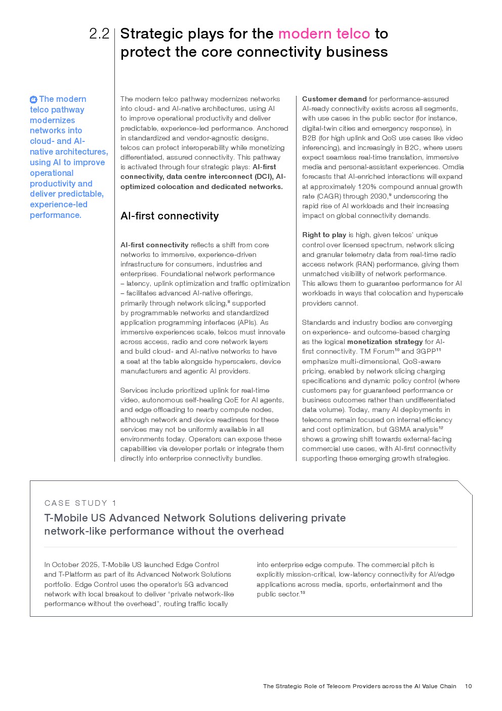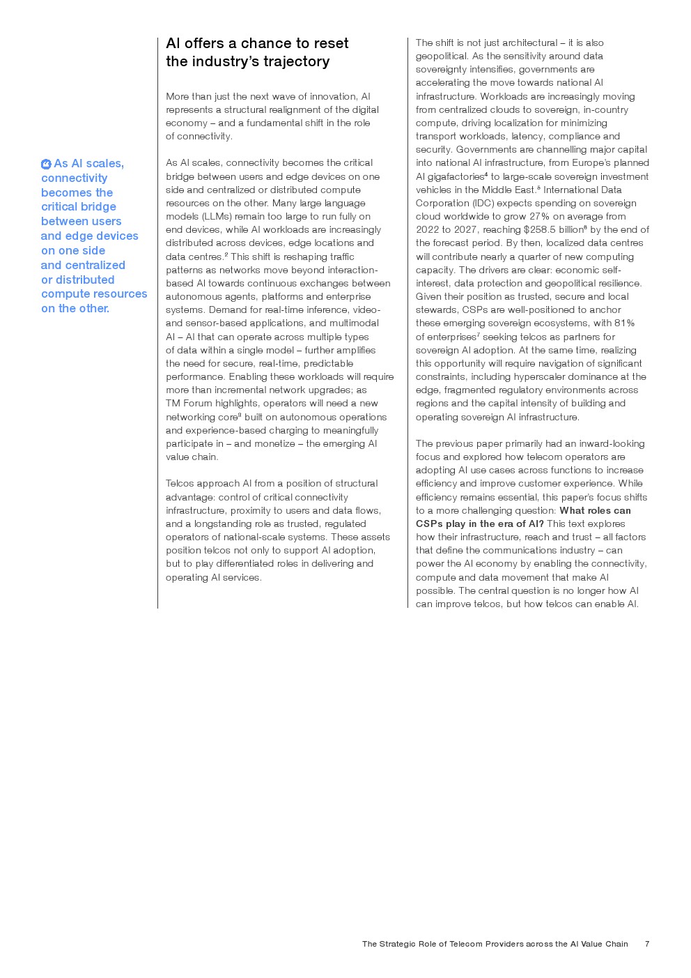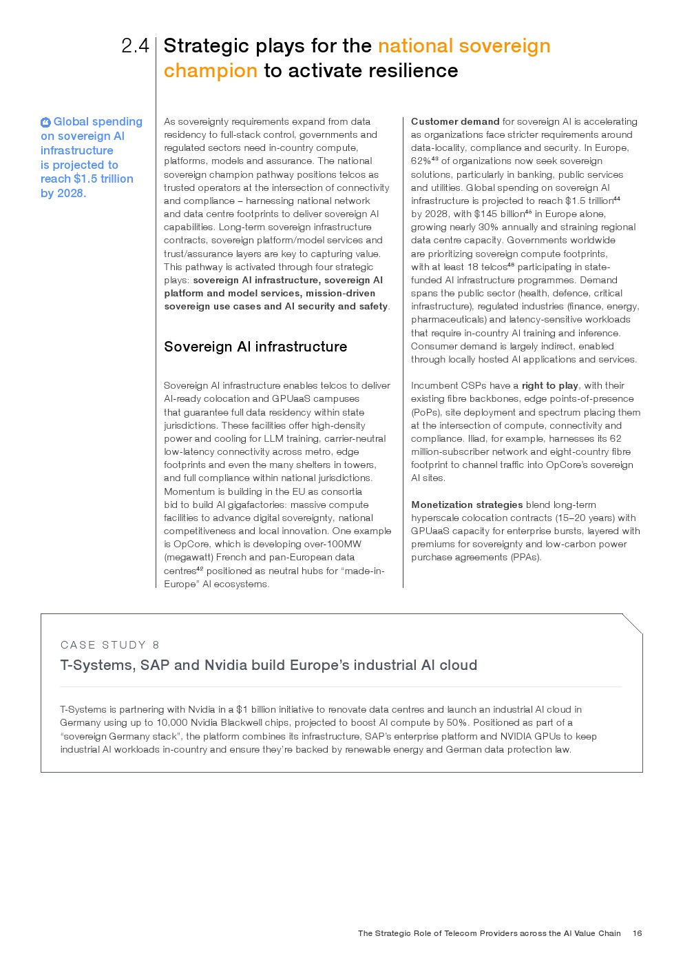 AI的引入正在重塑三层基础架构。首先,网络从“尽力而为”转向“AI优先、体验保障”,推动可编程连接与QoS定价体系形成。其次,基础设施由静态容量转向按需消费型AI算力与托管服务。再次,计算体系从全球云转向本地主权架构,IDC预计主权云支出至2027年将达2585亿美元,年复合增长27% 。这一演进使电信网络成为连接算力与终端的关键枢纽。
