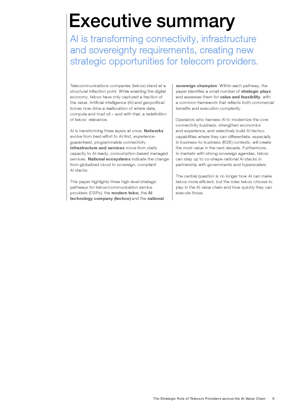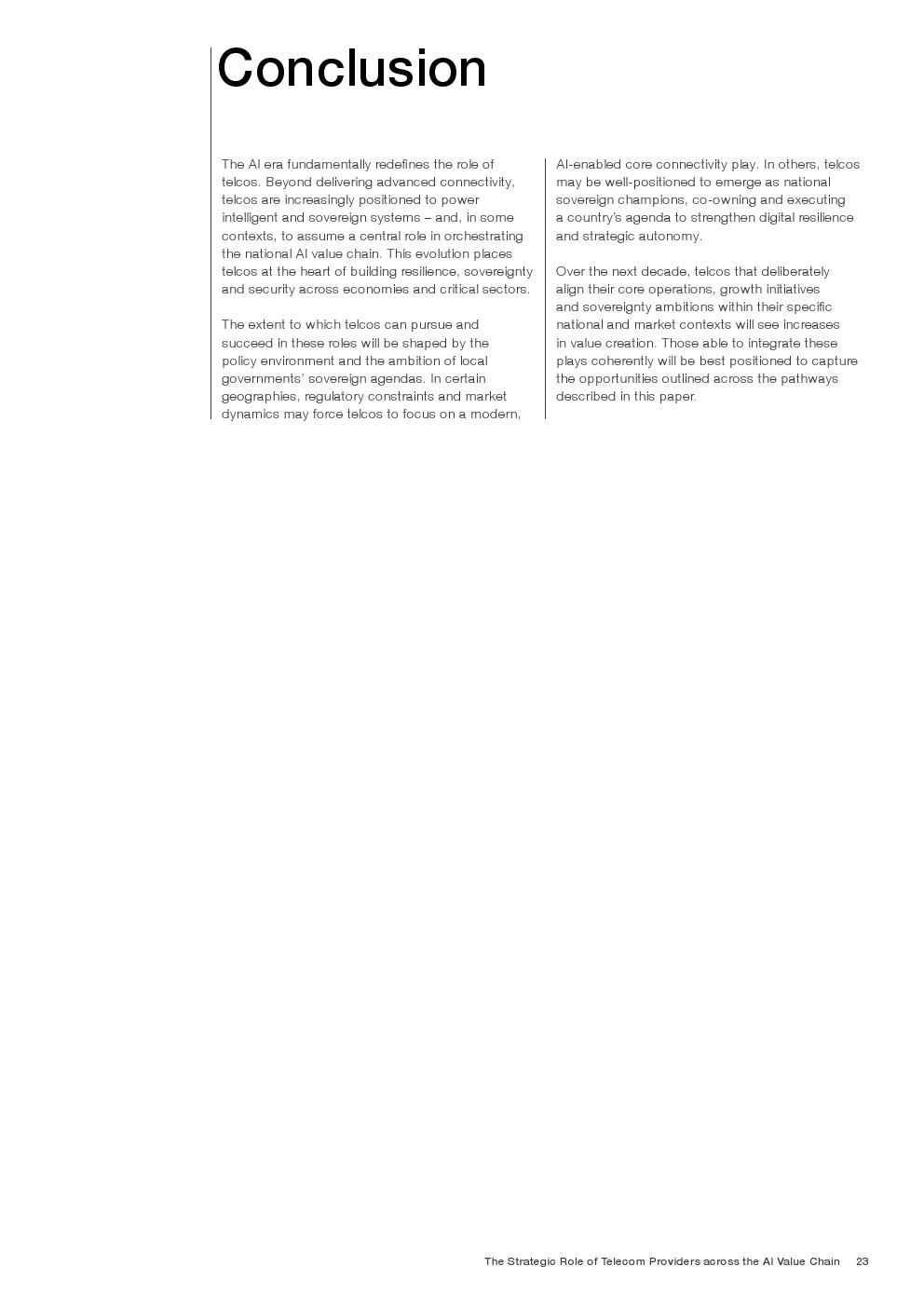 总体来看,电信行业正从“基础设施提供者”向“AI价值链协调者”转型。短期内,AI优先网络与DCI将提供最具确定性的收益来源;中期看,AI服务与平台能力决定增长上限;长期则取决于是否能在主权AI体系中占据核心节点。未来十年,能够实现连接、算力与治理能力一体化的运营商,将重塑行业价值分配格局,成为AI时代新的基础性平台。