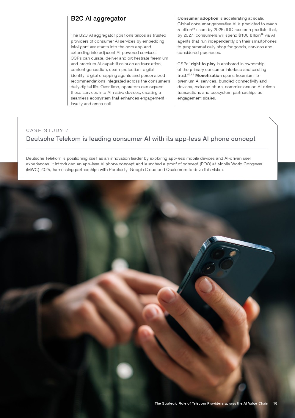 需求侧结构亦在发生变化。企业层面,86%的企业预计三年内将采用NaaS模式,94%的企业将依赖AI产品化解决方案 。消费者侧,生成式AI用户预计2026年达50亿,2027年通过AI代理产生的消费规模将达1000亿美元 。需求从连接转向算力与智能服务,直接改变电信行业收入结构。