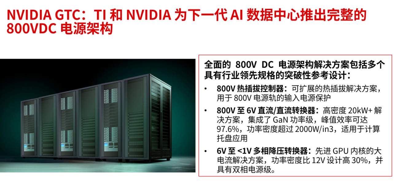 随着NVIDIA等巨头将GPU功耗推高至千瓦级别,传统的12V配电方案因电流过大导致的导线损耗(I²R)已无法忍受。行业正向48V甚至800V配电架构演进。 在NVIDIA GTC上,TI展示了与NVIDIA合作的完整800VDC电源架构。在这个架构中,IsoShield模块负责为高压监控和热插拔控制提供隔离偏置。