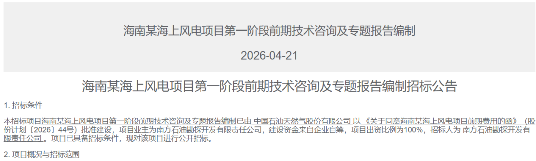 4月21日,中国石油招标投标网发布《海南某海上风电项目第一阶段前期技术咨询及专题报告编制招标公告》。