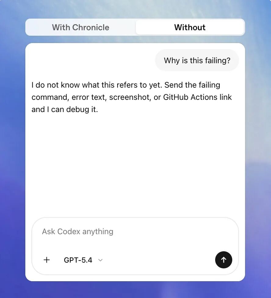 官方也配了一张关 Chronicle 的对比截图。同样这句 why is this failing,Codex 会直接说 I do not know what this refers to yet: