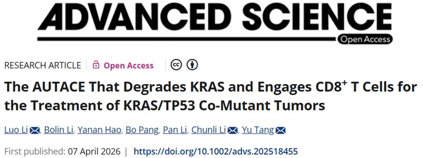 KRAS 与 TP53 共突变常与高度侵袭性、治疗耐药性肿瘤密切相关,且此类肿瘤治疗手段极为有限。 2026年4月7日,重庆医科大学唐瑜、李春莉、Li Luo共同通讯在Advanced Science(IF=14.1)在线发表题为The AUTACE That Degrades KRAS and Engages CD8+ T Cells for the Treatment of KRAS/TP53