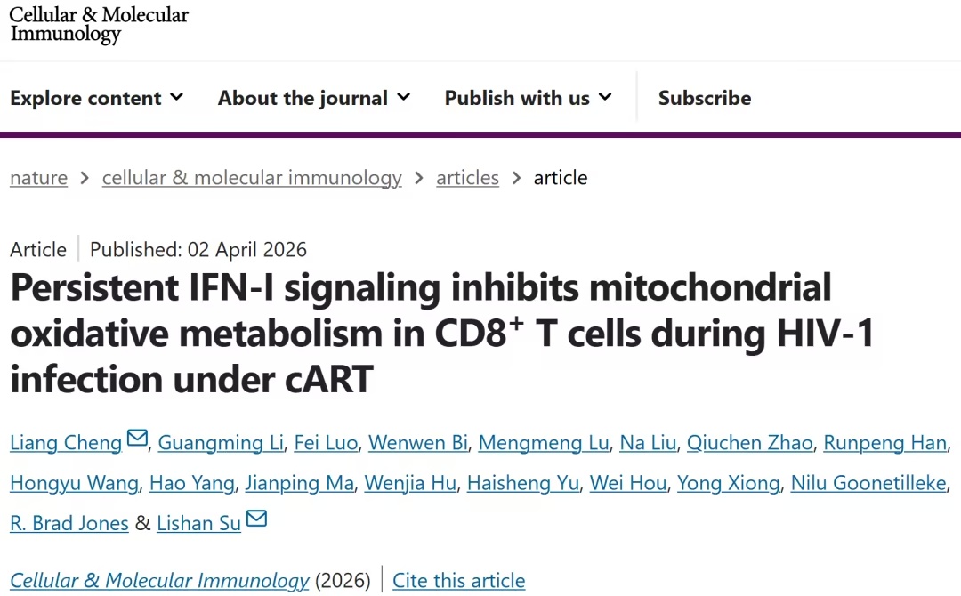在HIV-1感染的漫长战役中,CD8+ T细胞是关键的抗病毒战士,但其功能在慢性感染中会逐渐耗竭,导致病毒控制失败。尽管联合抗逆转录病毒疗法能抑制病毒复制,却无法逆转这种免疫耗竭。 2026年4月2日,马里兰大学苏立山教授团队与武汉大学程亮教授团队在Cellular & Molecular Immunology 在线发表题为Persistent IFN-I signaling inhibits m
