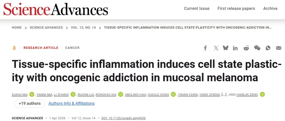 黏膜黑色素瘤(Mucosal Melanoma, MM)是一种起源于黏膜组织的侵袭性黑色素瘤亚型,其对皮肤黑色素瘤有效的疗法表现出抵抗性。 2026年4月1日,上海交通大学曾汉林和郭伟共同通讯在Science Advances 在线发表题为Tissue-specific inflammation induces cell state plasticity with oncogenic addict