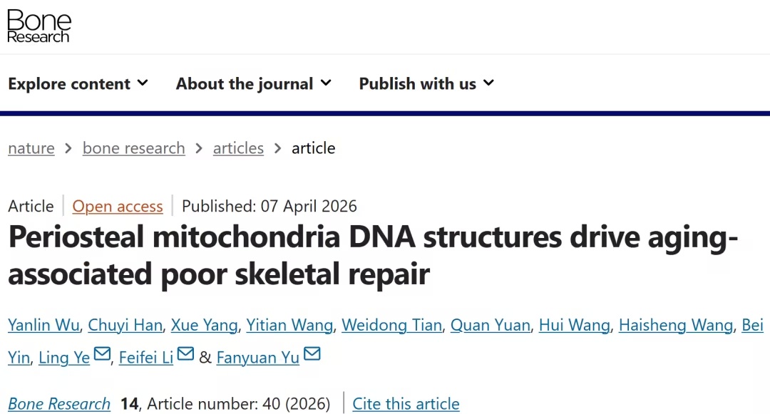 随着全球人口老龄化加剧,老年骨折后难以愈合已成为导致残疾、死亡风险增加的重要临床难题。骨骼修复能力为何随年龄增长而急剧下降?其根本机制一直悬而未决。 2026年4月7日,四川大学华西口腔医院余钒源副教授、李飞飞副教授、叶玲教授团队于Bone Research 发表了题为Periosteal mitochondria DNA structures drive aging-associated poo