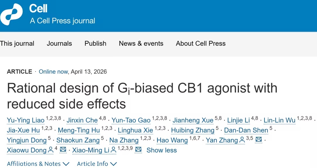 大麻素受体CB1是研发下一代非阿片类镇痛药的关键靶点,但其全身激动剂带来的精神活性、运动障碍等严重副作用,长期阻碍了其临床应用。如何将镇痛效益与不良反应“脱钩”,是药物设计的核心挑战。 2026年4月13日,浙江大学医学院李晓明教授团队联合药学院董晓武和医学院张岩团队合作(廖宇莹,车金鑫,高云涛、薛建恒、李林洁、吴林林为本文共同第一作者)在Cell 在线发表题为Rational Design of