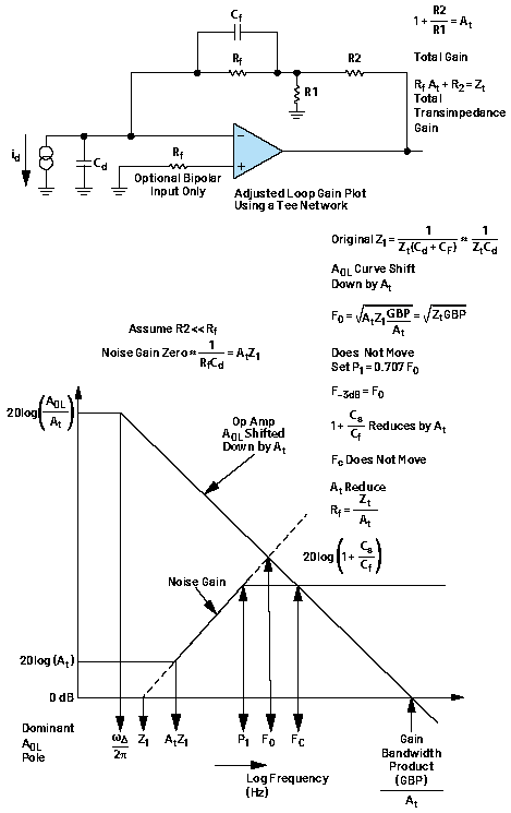 第一部分首先介绍了基本TIA设计的一种简化补偿流程,随后通过添加一个T型网络,成功地将所需的补偿电容提升到高于寄生电容的水平。第二部分将展示该T型网络对电路环路增益(LG)图的影响,并阐明这一影响与T型网络设计代数之间的对应关系。引言通过调整环路增益(LG)图中的相关项,可以直观展示第一部分中的T型网络代数。这种方式有助于可视化地理解T型网络的作用。接下来,我们将评估T型网络对不同输出散粒噪声和积