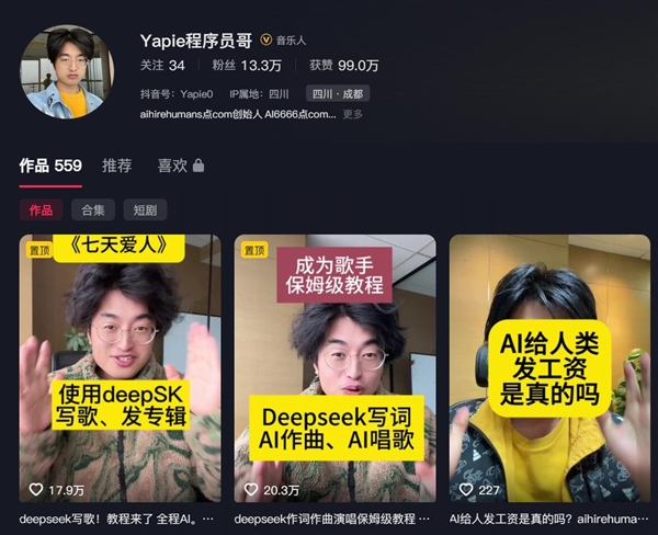 3月23日消息,近日,一首名为《七天爱人》的歌曲在网络上引发了广泛关注。令人惊讶的是,这首歌的创作者Yapie并非职业音乐人,而是一名程序员。 据媒体报道,Yapie仅用了2小时时间,通过DeepSeek辅助创作,便完成了这首AI歌曲。该作品随后迅速登上了热搜榜,展现了人工智能在创意领域的巨大潜力。 这首由程序员跨界创作的单曲表现惊人。在短短两周的时间内,它就为创作者带来了高达五位数的版权收益。这