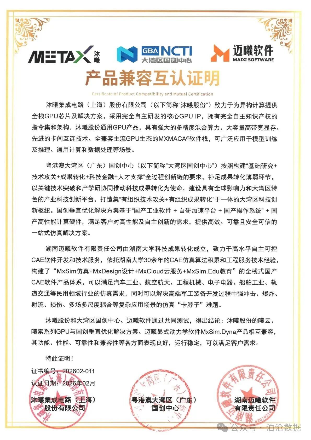 粤港澳大湾区国家技术创新中心工业软件产业发展中心(以下简称国创工软)作为国产工业软件生态核心枢纽,勇担产业创新引领重任,牵头联合国产高性能服务器(厂商)、沐曦股份国产GPU、国产自主操作系统(厂商),以及深圳十沣科技、湖南迈曦软件、北京适创科技、苏州舜云工程软件四家头部CAE 工业软件企业,依托中心在高性能服务器领域的深厚技术积淀,圆满完成全栈产品兼容性互认证,成功实现国产工业软件在 “高性能服务