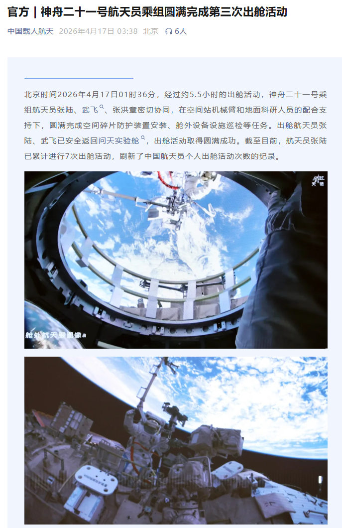 IT之家 4 月 17 日消息,据中国载人航天工程办公室,北京时间 2026 年 4 月 17 日 01 时 36 分,经过约 5.5 小时的出舱活动,神舟二十一号乘组航天员张陆、武飞、张洪章密切协同,在空间站机械臂和地面科研人员的配合支持下,圆满完成空间碎片防护装置安装、舱外设备设施巡检等任务。IT之家从公告获悉,出舱航天员张陆、武飞已安全返回问天实验舱,出舱活动取得圆满成功。截至目前,航天员张