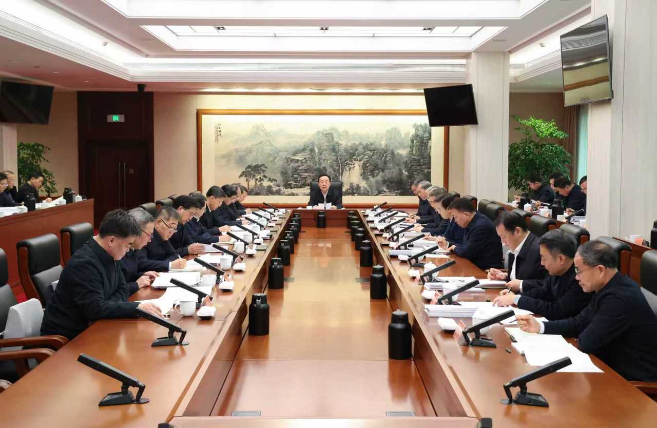 2月2日上午,省委常委会召开会议,省委书记王浩主持。记者 李震宇 摄2日上午,省委常委会召开会议,传达学习习近平总书记近期重要讲话重要文章精神,研究部署我省贯彻落实意见;听取有关工作汇报。省委书记王浩主持会议。会议强调,要认真学习贯彻习近平总书记在中共中央政治局第二十四次集体学习时发表的重要讲话精神,聚焦聚力建设创新浙江、因地制宜发展新质生产力,加快构建浙江特色现代化产业体系,做深做透“两篇大文章
