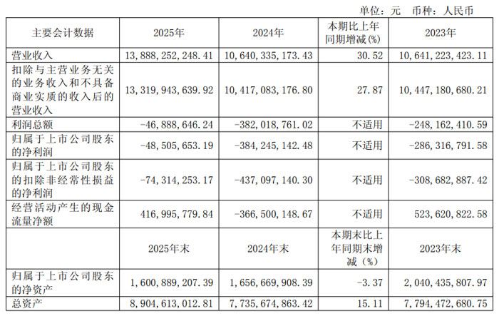 4 月 15 日,福建福日电子股份有限公司(股票代码:600203,简称 “福日电子”)披露 2025 年年度报告。报告显示,公司全年实现营业收入138.88 亿元,同比增长30.52%;归属于上市公司股东的净利润为 **-0.49 亿元 **,较 2024 年大幅减亏,经营活动产生的现金流量净额由负转正,整体经营质量持续改善。 财务数据方面,2025 年福日电子营业总收入达138.88 亿元,同